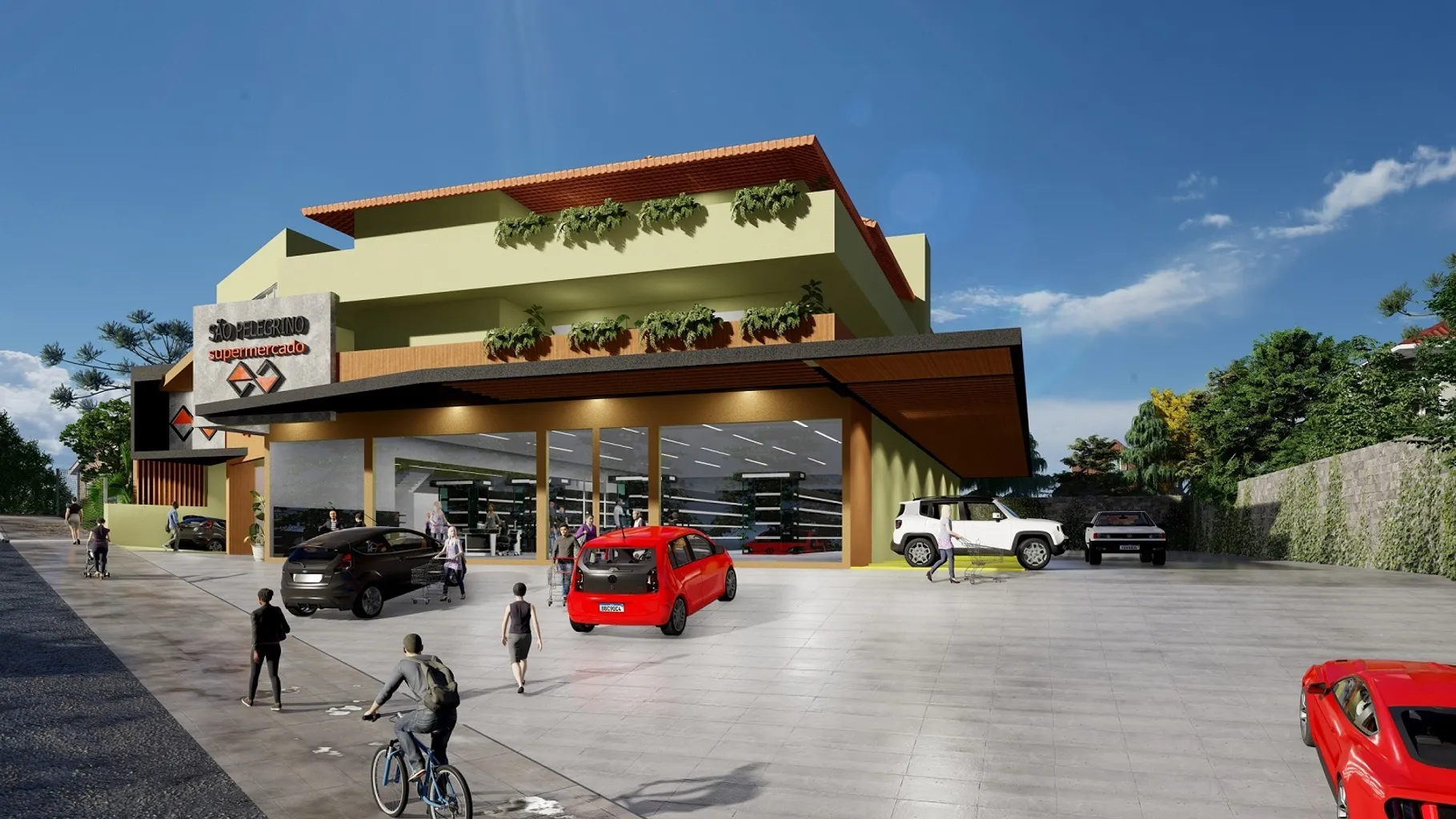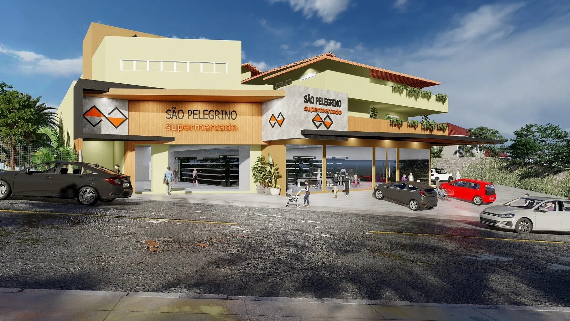 Projeto de ampliação do Supermercado São Pelegrino em Nova Prata. Arquitetônico - Kátia B. Soliman Imagens 3D por Tiago Brum. Projetos: Estrutural e Complementares - Pillar Engenharia